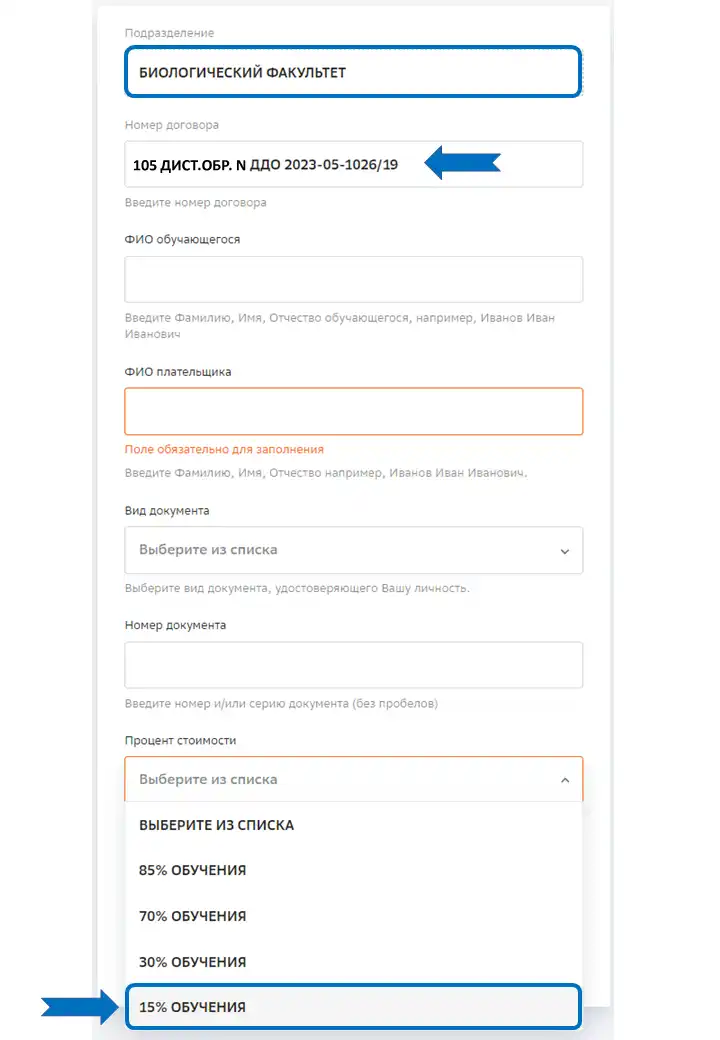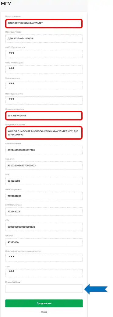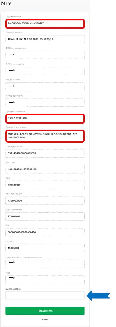 • 15% от общей суммы перечисляется на расчетный счет центральной бухгалтерии МГУ.