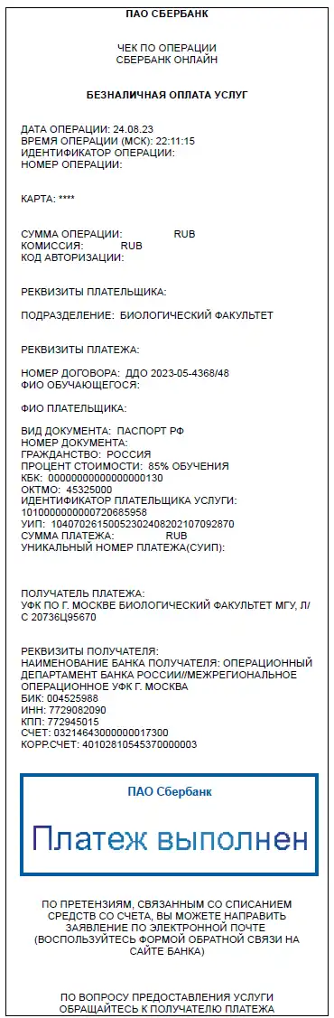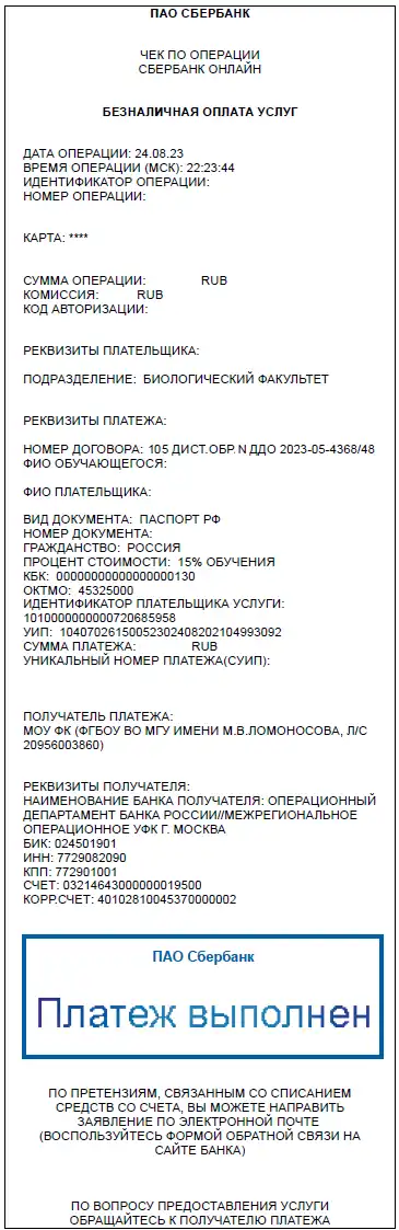 Оба чека по операциям отправьте по электронной почте: info.pkurs.bio@org.msu.ru