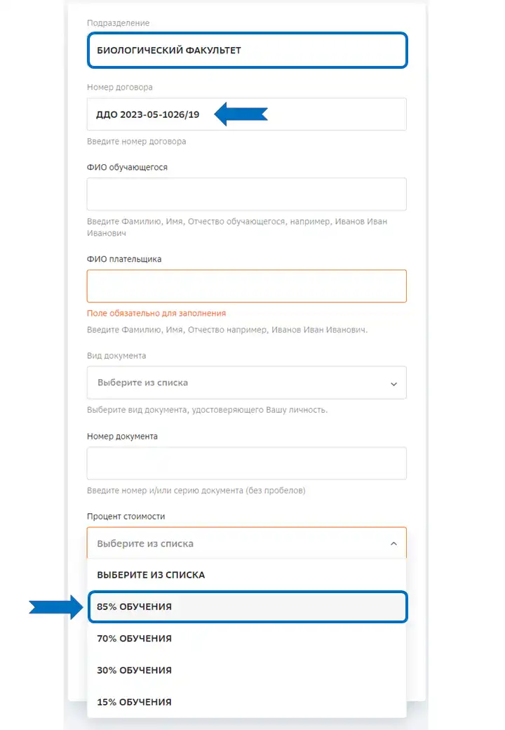 • 85% от общей суммы перечисляется на расчетный счет биологического факультета МГУ,